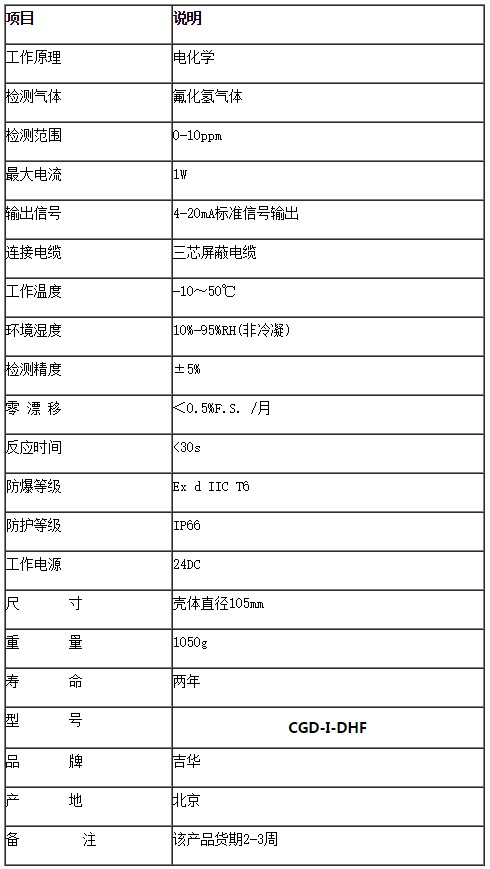 氟化氢报警器探头(数字显示型) CGD-I-DHF氟化氢探头(氟化氢气体报警器探头,氟化氢变送器)(数字显示型) CGD-I-DHF采用优质进口传感器,优质金属防爆外壳,具有良好的性价比,投入市场多年来受到各行业用户的广泛好评。氟化氢报警器探头与报警控制主机共同组成完整的氟化氢报警器。我公司本产品,质量稳定,价格优势明显,欢迎咨询电话: 010-51292816。