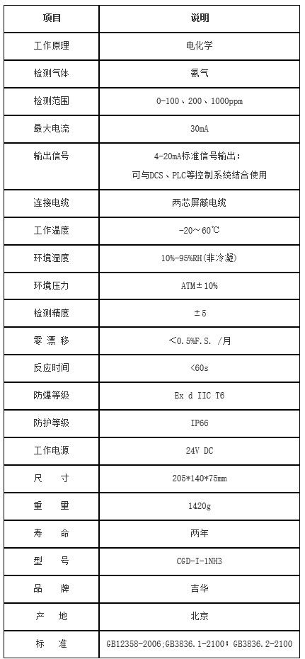 产品采用先进进口电化学传感器,优质金属防爆外壳,优质、准确地进行氨气浓度监测并用价格低廉,