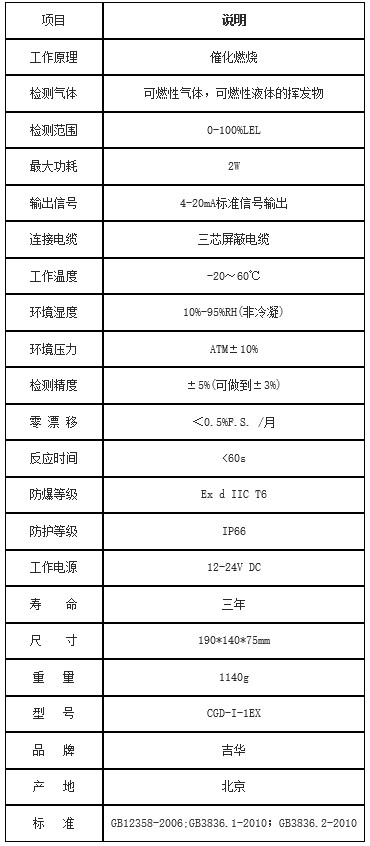 可燃气体探测器技术指标: