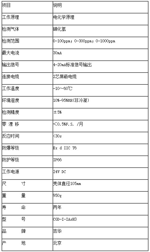砷化氢探头(变送器)CGD-I-1ASH3采用优质进口传感器,优质金属防爆外壳,具有良好的性价比,投入市场多年来受到各行业用户的广泛好评。砷化氢报警器探头与报警控制主机共同组成完整的砷化氢报警器。我公司本产品,质量稳定,价格优势明显,欢迎咨询电话: 010-51292816。