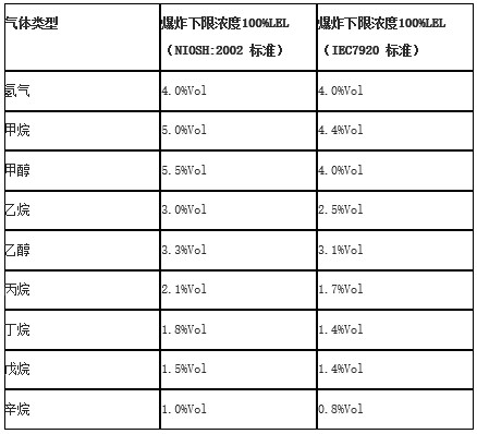 附表:常见的可燃气体爆炸下限浓度表